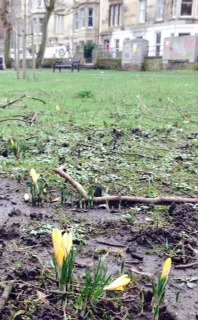 The weather has been pretty bad here lately, with two storms so big they have been named, some sleet and snow and rain (simultaneously), and some 70 mph wind. These conditions make training (both football training and running) outside not very fun. Yesterday I was walking home through the Meadows, staring at the ground so the wind wouldn't blow ice into my eyes, when I saw these little yellow crocuses sprouting (rather miraculously) out of the cold hard ground. Could it be that spring is on its way?