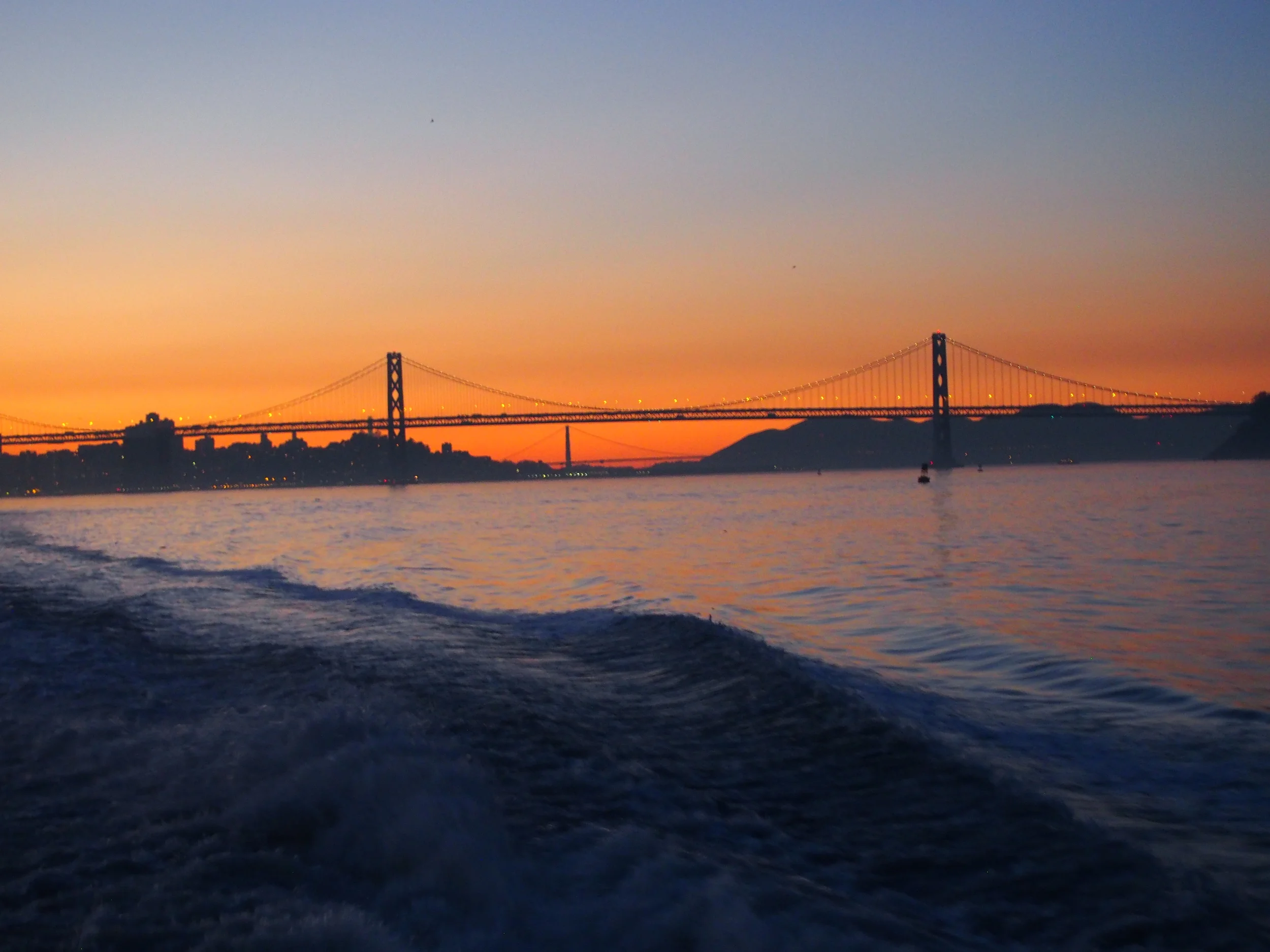 After walking around with my grandparents, I met my dad in the Ferry Building. We wanted to get a latte, "the best in San Francisco", according to him, but the cafe closed at 3:30 (what kind of cafe does that?) and we missed it. Instead, we worked together in his office for a while and then took the ferry to Alameda, where the Desert Wolf was parked. The back deck of the ferry allowed for some great photos of the bridge and the water.